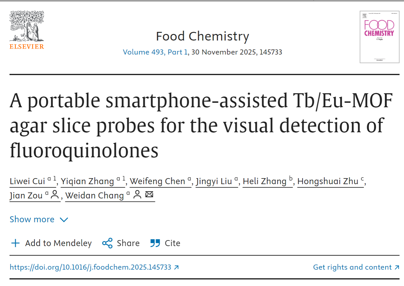 近日,食品与生物工程学院(酒业学院)教师崔丽伟在国际顶级学术期刊《Food Chemistry》(中国科学院1区TOP期刊,IF:9.8)上发表了题为“A portable smartphone-assisted Tb/Eu-MOF agar slice probes for the visual detection of fluoroquinolones”的研究论文。该成果我校为第一署名单位和通讯单位,崔丽伟和20食安01班学生张怡倩为共同第一作者,食品与生物工程学院(酒业学院)院长邹建,教师常惟丹为通讯作者。这是食品与生物工程学院(酒业学院)食品安全快速检测团队在国际重要影响力期刊上发表高水平论文的一次重大突破。