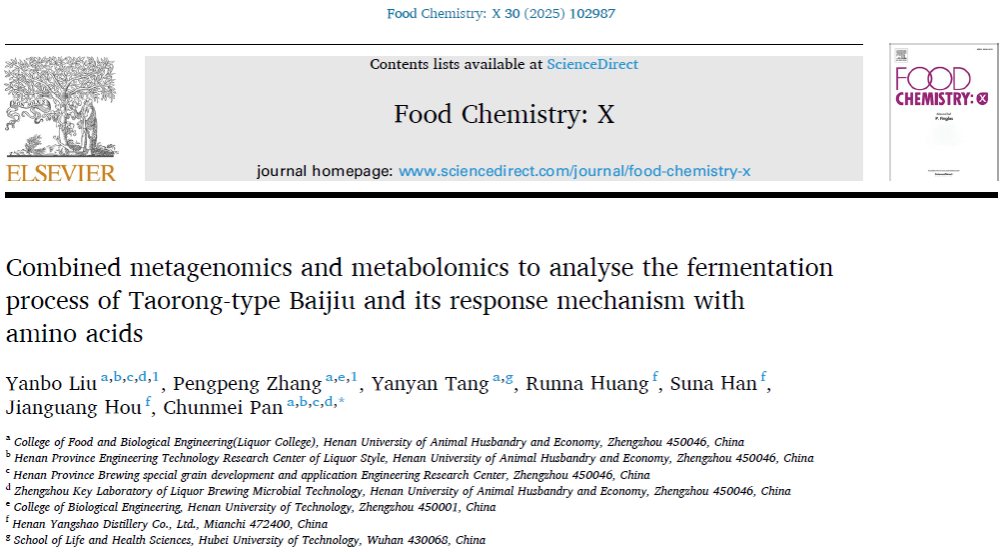 近日,我校食品与生物工程学院(酒业学院)酿酒团队师生在中科院SCI1区Top期刊《Food Chemistry: X》(IF:8.2)上发表了题为“Combined metagenomics and metabolomics to analyse the fermentation process of Taorong-type baijiu and its response mechanism with amino acids”的研究论文。刘延波副教授及其联合培养的硕士研究生张朋朋为共同第一作者,潘春梅教授为通讯作者,我校为第一署名单位和通讯单位。