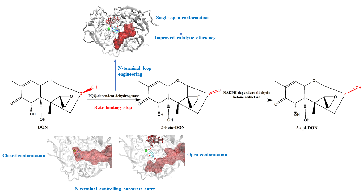 自2020年起,团队与河南亿万中元生物技术有限公司合作开展呕吐毒素降解酶研究。通过深入解析依赖PQQ的醇脱氢酶N端loop结构对呕吐毒素催化活性的调控机制,发现DepA的N端loop在活性口袋上方形成具有"盖子"功能的动态结构,呈现"开"与"关"两种构象,对控制底物进入活性口袋起关键作用。鉴于不同依赖PQQ的醇脱氢酶N端loop长度存在显著差异,因此构建了DepA的N端截短突变体。与野生型相比,最优截短突变体N21的催化效率(kcat/Km)提升7.9倍,最适反应温度升高5℃。分子动力学模拟表明,突变体N21通过降低N端loop的柔性,稳定"开"构象,拓宽底物通道以促进底物进入活性中心;同时重塑活性中心空间构象,强化DON与活性中心的相互作用,并缩短质子转移距离,最终显著提升催化活性。该成果为呕吐毒素的高效脱毒及依赖PQQ的醇脱氢酶催化活性改造奠定了重要基础。