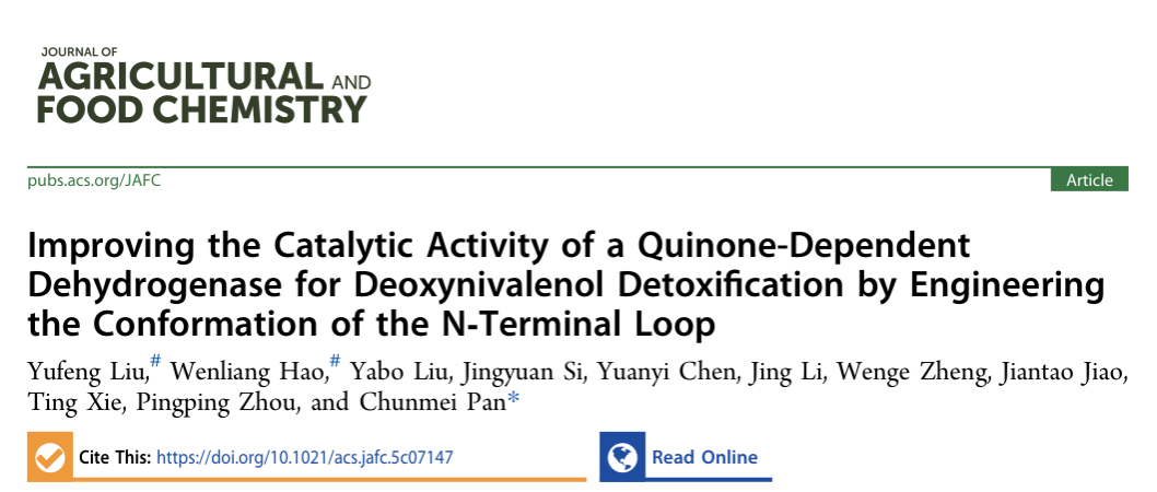 近日,学校发酵工程团队在呕吐毒素降解脱毒领域取得突破性进展,其研究成果"Improving the Catalytic Activity of A Quinone-Dependent Dehydrogenase for Deoxynivalenol Detoxification by Engineering the Conformation of the N-terminal Loop"正式发表于Journal of Agricultural and Food Chemistry(中科院1区Top期刊,影响因子6.2)。食品与生物工程学院(酒业学院)刘宇锋博士为第一作者,潘春梅教授为通讯作者。该研究获得了河南省科技攻关项目及河南亿万中元生物技术有限公司的资助。