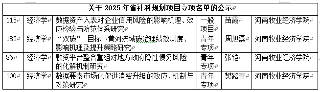 近日,河南省2025年度省社科规划项目立项公示,金融与会计学院科研工作再创佳绩。苗霞、周旭磊、张铠、樊路青四位博士的课题成功获批立项,立项数量创下学院该类项目历史新高。
