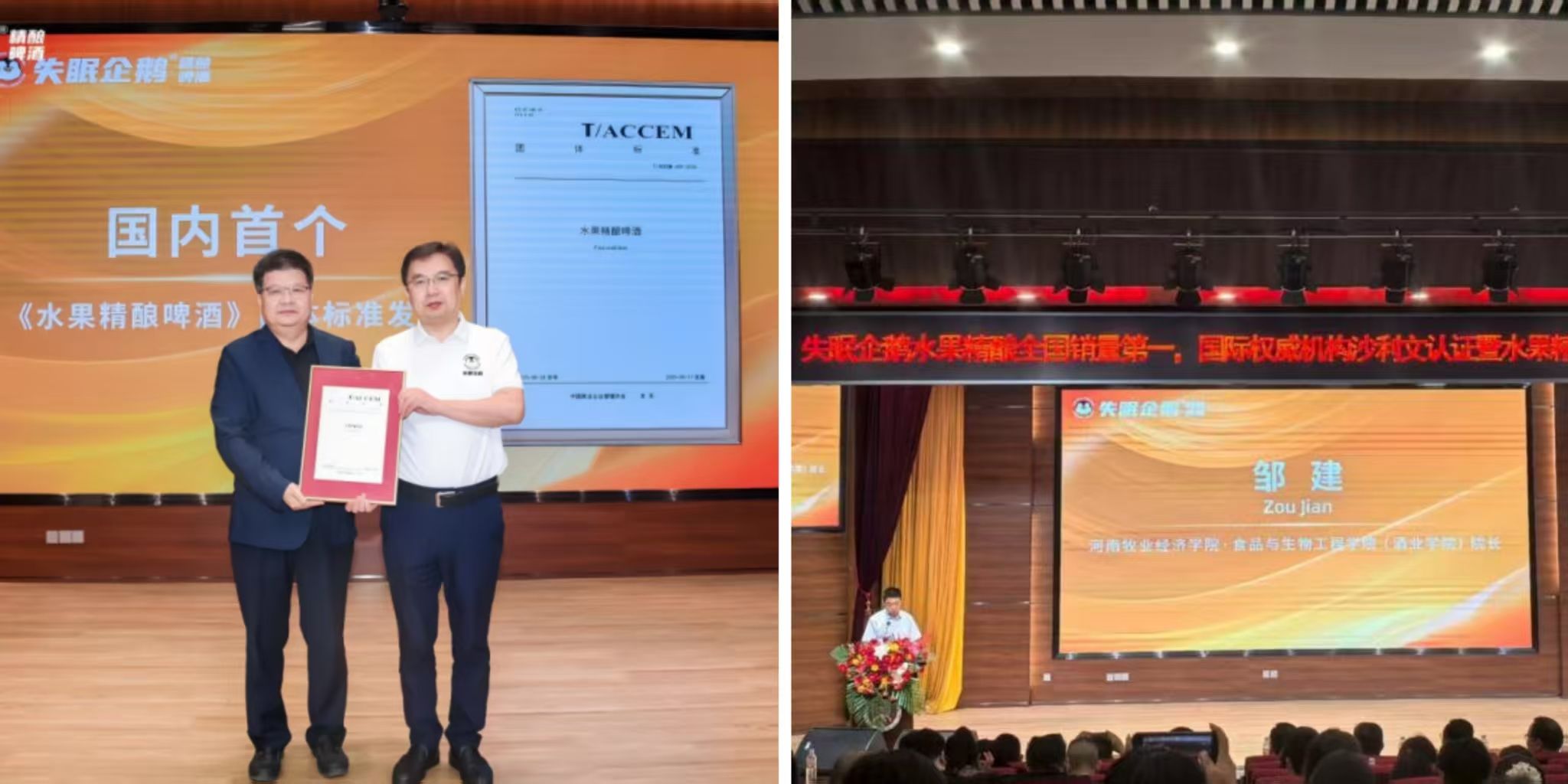 食品与生物工程学院(酒业学院)党委书记赵安勇为失眠企鹅创始人、我校食品专业优秀校友刘元昌颁发国内首个《水果精酿啤酒团体标准》。