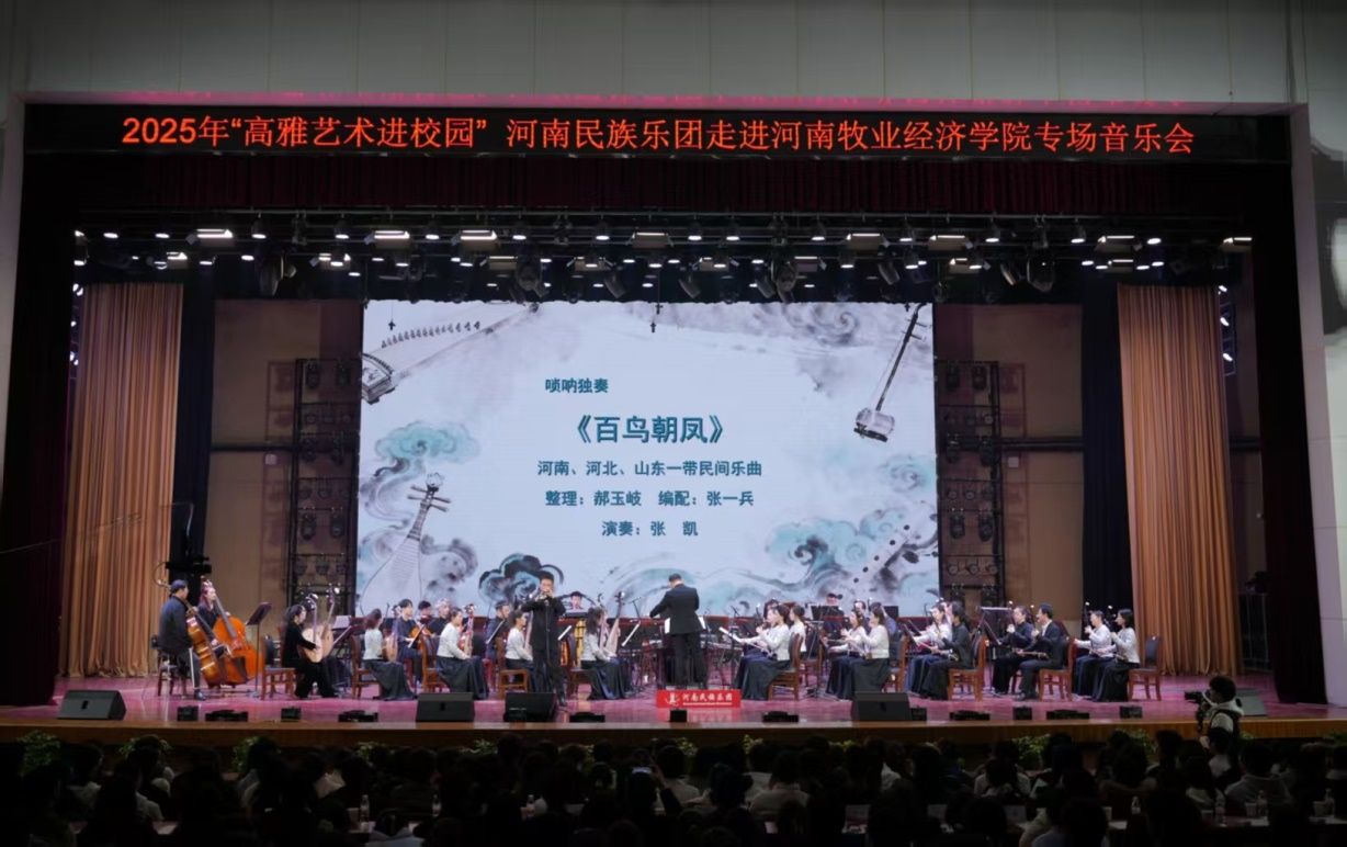 河南民族乐团为师生带来了十余个经典和现代新编曲目。古曲新编的民族管弦乐《将军令》,以铿锵的旋律,瞬间将观众带入金戈铁马的历史意境;笛子独奏《牧民新歌》,以其独具“雄而雌、强而弱、刚而柔、狂而雅、神而洁”的神韵展现出新时期牧民在广袤的草原牧场上生机勃勃的精神风貌;琵琶齐奏《十面埋伏》完美地表现了名闻古今的楚汉之战,旖旎壮美,荡气回肠;极具现代感的五重奏《平衡》,是民族乐器翻演西方流行音乐的探索;民族室内乐《大鱼》《护花使者》,以古筝、笛箫、琵琶等民族乐器为核心,打破曲风边界,将民乐的清雅韵味与摇滚乐的激情、流行乐的动感完美融合。艺术家们还为师生观众介绍了二胡家族、提琴家族不同乐器的音色,让同学们了解了柳琴、扬琴、阮、唢呐、笙等中国传统乐器知识,激发了同学们对民族传统文化的浓厚兴趣。