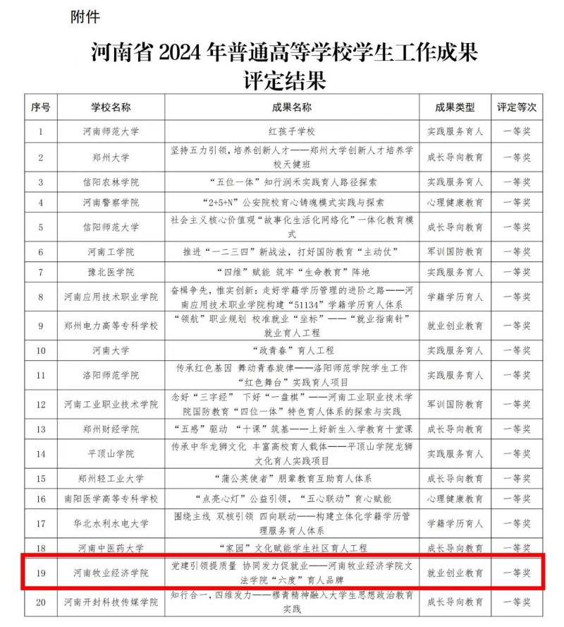 近日,河南省2024年普通高等学校学生工作成果评定结果揭晓。经过严格评审,文法学院申报的学生工作项目“党建引领提质量 协同发力促就业——华亿在线手机版(大中国区)文法学院‘六度'育人品牌”凭借扎实的育人成效和显著的创新特色,荣获省级一等奖。