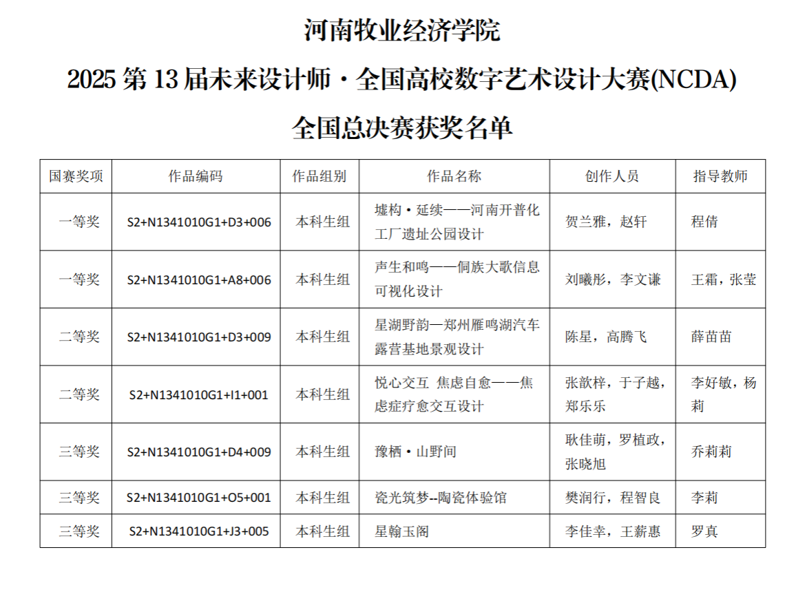 近日,在2025第13届未来设计师·全国高校数字艺术设计大赛(NCDA)全国总决赛中,我校艺术学院师生凭借出色的专业能力与创新设计,共斩获一等奖2项、二等奖2项、三等奖3项,充分彰显了学校卓越的教学成效与人才培养水平。
