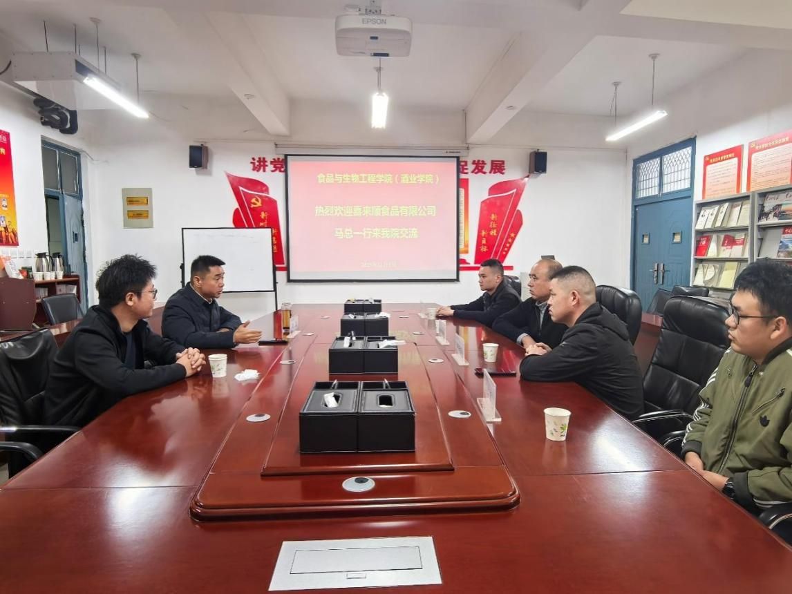11月3日,驻马店市喜来顺食品有限公司董事长马向锋一行到食品科学学院洽谈产品研发、科研合作等相关事宜。食品科学学院院长邹建出席座谈交流会。