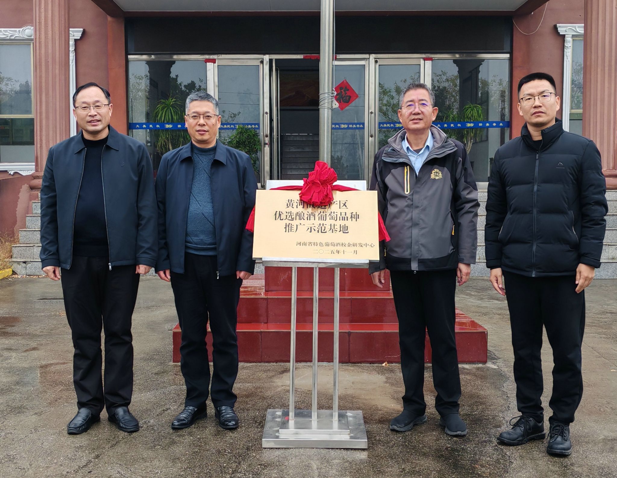 在河南帝森酒业有限公司期间,专家团与企业领导共同为“黄河故道产区优选酿酒葡萄品种示范推广基地”揭牌。(社会服务办公室/供稿)