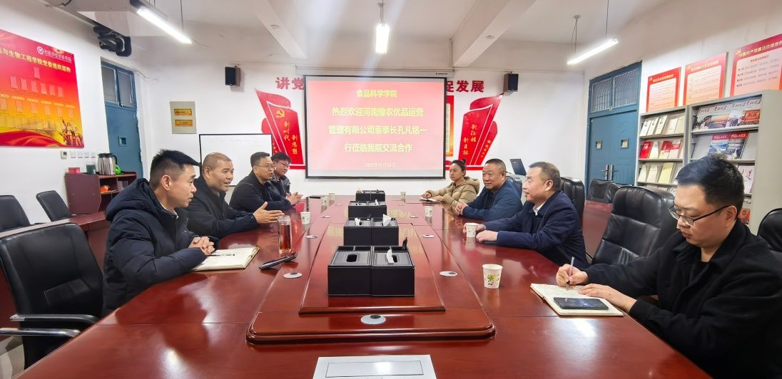 11月26日,河南豫农优品运营管理有限公司董事长孔凡铭一行到访食品科学学院。双方围绕农产品优选方案、关键核心指标及技术、标准体系的建设与科研深度合作等事宜展开深入交流。食品科学学院党委书记冯广鹏、院长邹建及相关教师代表参加座谈会。