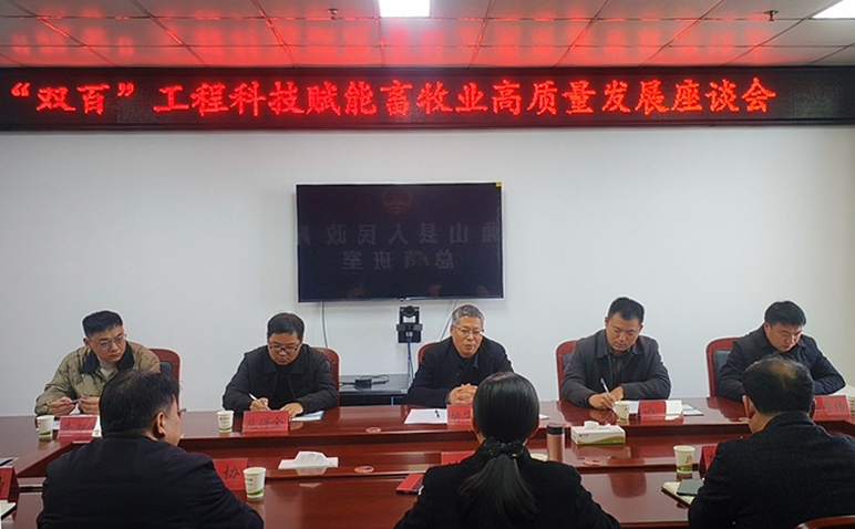 为深入推进“百名专家助百村(企)”工程(简称“双百”工程)落地见效,进一步强化校地、校企协同联动,为区域畜牧业高质量发展注入强劲动能,近日,我校社会服务办公室组织学校相关专家赴确山县参加“双百”工程科技赋能畜牧业高质量发展座谈会。确山县副县长刘冬梅,驻马店市科协学术部部长冯翔,我校社会服务办公室主任胡华锋,动物医药学院博士李厚伟,动物科技学院博士牛凯峰,食品科学学院博士危得全及确山县科协、畜牧中心、科技局、商务局、工信局等单位负责人参加座谈会。