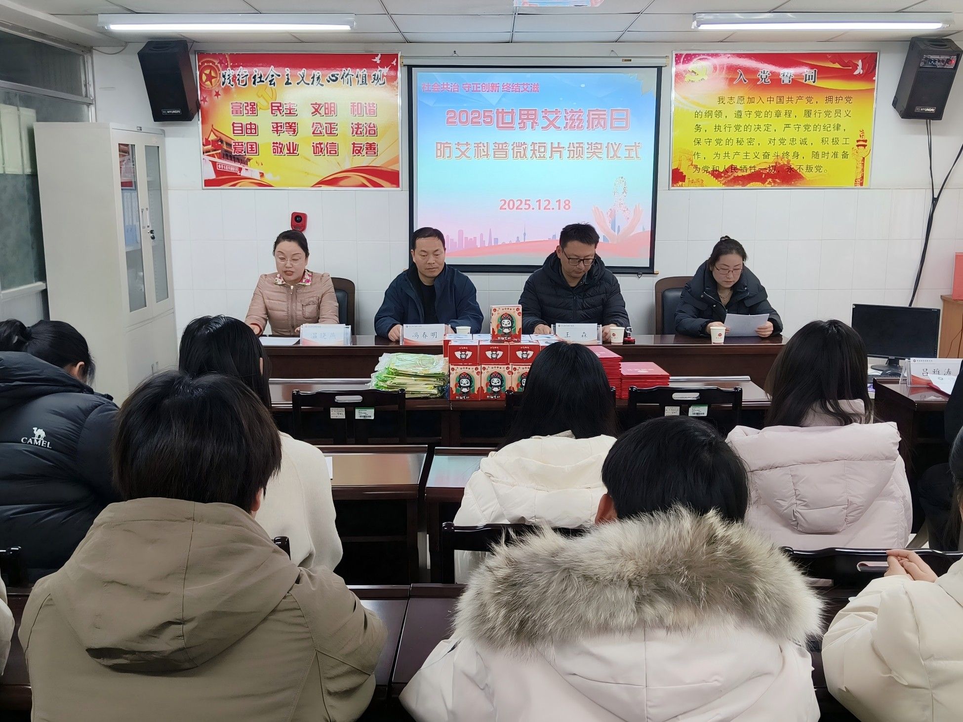 12月18日上午,我校2025年防艾科普微短片征集活动颁奖仪式在校医院会议室举行。校团委书记王森、校医院院长温晓燕、惠济区疾控中心主任冯春明出席颁奖仪式。