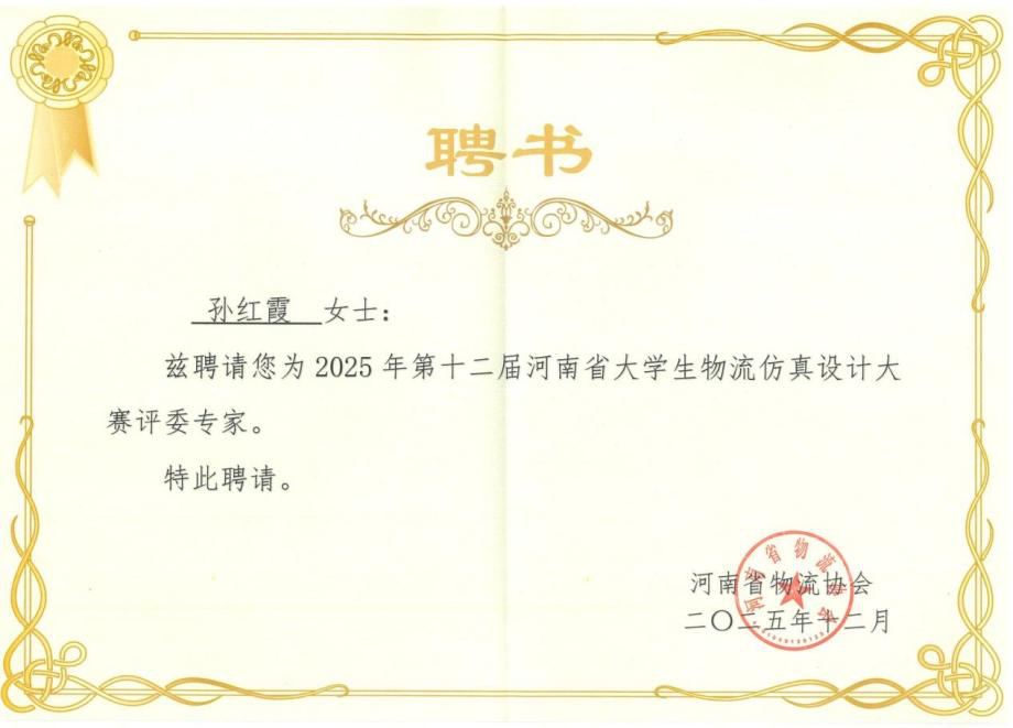 近日,河南省物流协会向我校物流与电商学院教师孙红霞博士颁发聘书,正式聘请其担任第十二届河南省大学生物流仿真设计大赛评委专家。