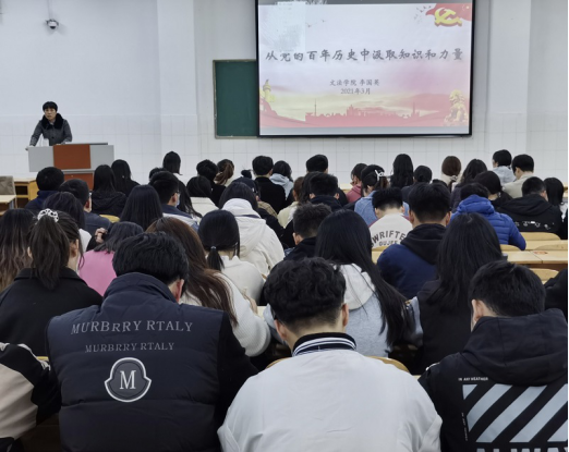 3月16日晚,文法学院院长李国英教授在英才校区W-109室讲授春季开学思政第一课,课程题目为《从党的百年历史中汲取知识和力量》。文法学院全体学生党员、入党积极分子聆听课程。