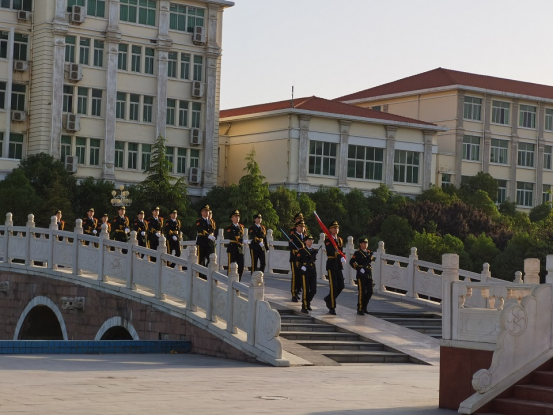 国旗护卫队迈着铿锵有力的步伐护送国旗走到升旗台,升旗手将五星红旗高高扬起,鲜艳的五星红旗在雄壮的国歌声中冉冉升起,广大师生群体面向国旗肃立,向国旗行注目礼,齐声高唱中华人民共和国国歌。