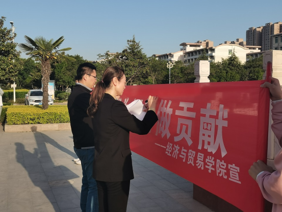 主题升旗仪式进一步增强了青年大学生爱党、爱国、爱校的责任意识。在庄严的国旗下,经济与贸易学院师生在“青年担当责任强,我为评估做贡献”条幅上郑重签名。(经济与贸易学院供稿)