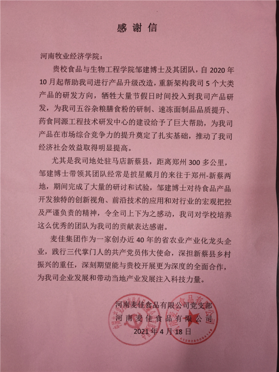 近日,食品与生物工程学院收到一封来自河南麦佳食品有限公司党支部和河南麦佳食品有限公司发来的感谢信,表达了对食品与生物工程学院科研团队的感谢。
