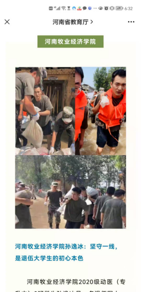 动物医药学院2020级动医升本02班孙逸冰战斗在防汛救灾的最前线。孙逸冰是一名退伍军人,2014年参军入伍,成为武警陕西总队的一名士兵。当兵期间,曾获得“优秀士兵”荣誉称号,作为“爱警精武好战士”受到嘉奖表彰,并于2016年退伍。7月24日,因泄洪、决堤等因素,鹤壁市淇县下属乡镇水位内涝,北阳镇部分村庄水位高达颈部,其他部分村庄水位达到腰部,情况十分紧急,多数老人、儿童以及放暑假的学生被困,时刻危及生命。在灾难面前,孙逸冰主动请缨,成为淇县退役士兵志愿救援队中的一员,在队长臧凯的组织下,带上县武装部提供的皮划艇、救生衣、探照灯等救援装备,第一时间志愿对鹤壁市淇县北阳镇水屯村、玖州国际物流园等多地点进行人员搜救和转移。经过大家几天几夜的英勇奋战,救援和转移玖洲国际物流园人民群众约150人。