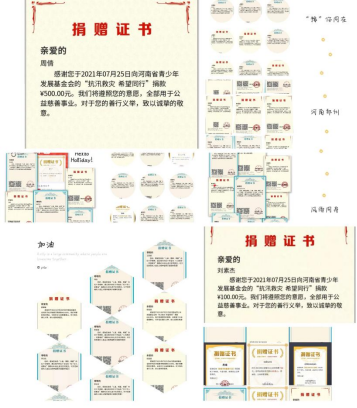 周倩表示,“作为一名党员,一名教师,在关键时刻应当尽一己之力、发挥作用、身体力行、共克时艰,小爱汇聚大能量,相信大家齐心协力一定能共度难关。”大学生艺术团学生刘素杰作为本次暴雨灾害的亲历受助者,她说:“当大水没过我的腰间时,是一位陌路的大叔攥紧了我的手,是消防官兵用血肉之躯筑起了挡水墙,我想将这份善意与温暖传递给更多的人”。