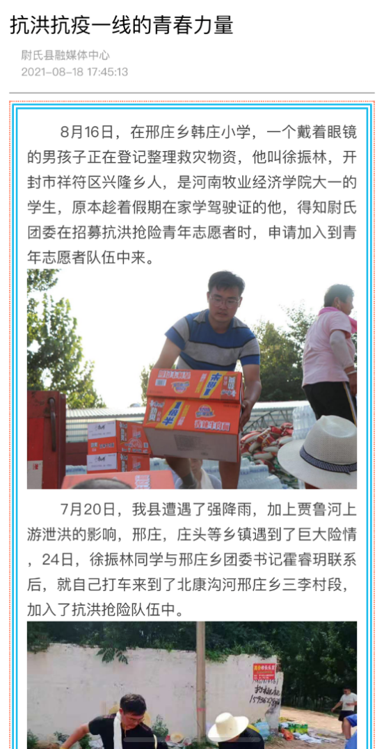 徐振林的防汛抗疫事迹受到了尉氏县媒体的关注,给予了详细报道。(陈瑛洁/文)