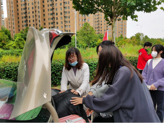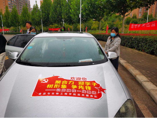 教师党员自发开出私家车,组建迎新生服务车队。一辆辆贴着“食品与生物工程学院党员服务队”车标的私家车来来往往,为新生运送行李。