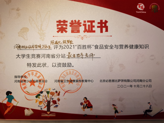 10月28日,2021年“百胜杯”食品安全与营养健康知识竞赛河南分赛站决赛在郑州进行,由我校食品与生物工程学院(酒业学院)李心悦、李梦杰、姚爱萍3名学生组成的“食代”青年战队与郑州大学、河南工业大学、河南农业大学代表队同台竞争。经过激烈角逐,“食代”青年战队获得季军,我校荣获优秀组织单位奖。