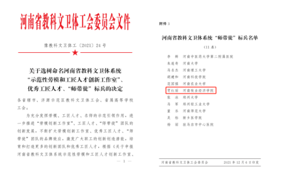 近日,河南省教科文卫体工会委员会印发《关于选树命名河南省教科文卫体系统“示范性劳模和工匠人才创新工作室”、优秀工匠人才、“师带徒”标兵的决定》(豫教科文卫体工〔2021〕24号),我校旅游学院教师贾红丽荣获河南省教科文卫体系统“师带徒”标兵荣誉称号,此项荣誉全省仅有11对。