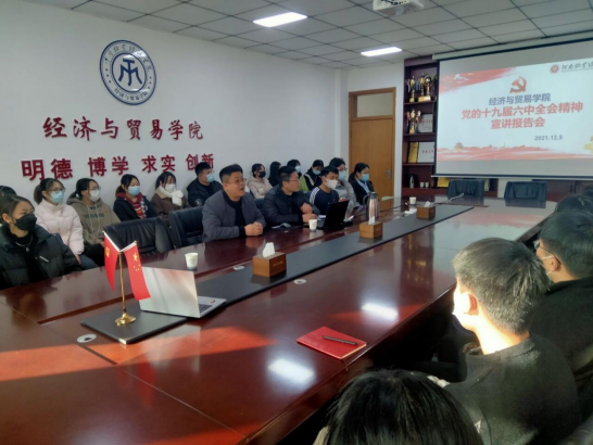 近日, 经济与贸易学院在英才校区教学办公楼327会议室召开党的十九届六中全会精神宣讲报告会,该院党委书记张松刚为全体学生党员宣讲“党的十九届六中全会精神”。