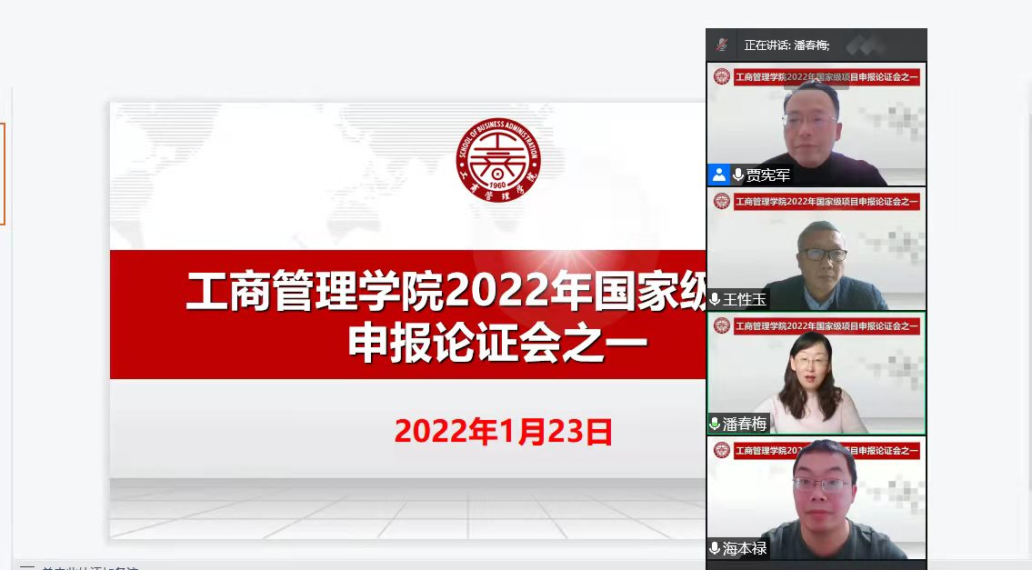 为进一步培养教师参与高层次科研项目的意识与能力、提高国家课题申报成功率,1月23日下午,工商管理学院在线上召开2022年度国家自科、社科基金申报首场论证会,邀请了教育部工商管理学科教指委委员、河南大学商学院院长、博士生导师王性玉教授,河南师范大学商学院副院长海本禄教授进行在线指导。我校科学技术处相关负责人,工商管理学院领导班子成员、博士及部分教师参加申报论证会。会议由工商管理学院院长贾宪军主持。
