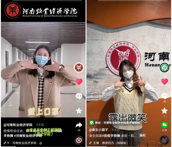 严格落实校园巡查,加大校园文明劝导力度,积极发动学生党员、入党积极分子和班干部在劝导区域值班,做到内防输入,外防输出;在公寓出入口安排志愿者对未佩戴口罩学生进行督查和温馨提醒,让志愿红闪耀在疫情防控一线;在抖音发布教师版和学生版疫情防控手势舞,利用学生喜闻乐见的方式进行疫情防控宣传,引导学生提高防护意识,共筑师生安全堡垒。