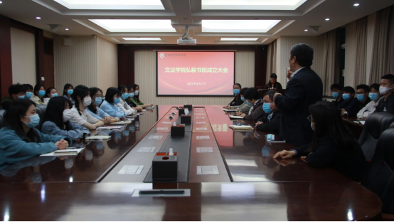 4月7日,文法学院弘毅书院成立大会在英才校区行政楼503召开。文法学院领导班子成员、教师代表、学生代表和第一批弘毅书院学员参加了会议。