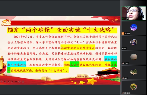 会上,第二教工党支部王会霞老师结合自身对河南省人才强省战略的研究,作了《学习贯彻河南省“十四五”人才发展人力资源开发和就业促进规划 锚定“两个确保”全面实施人才强省战略》专题讲座。她从“人才的内涵与国家的人才强国战略”“学习贯彻河南省‘十四五’人才发展人力资源开发和就业促进规划”“ 人才强省战略要处理好的相关问题”三个方面进行了详细阐述。