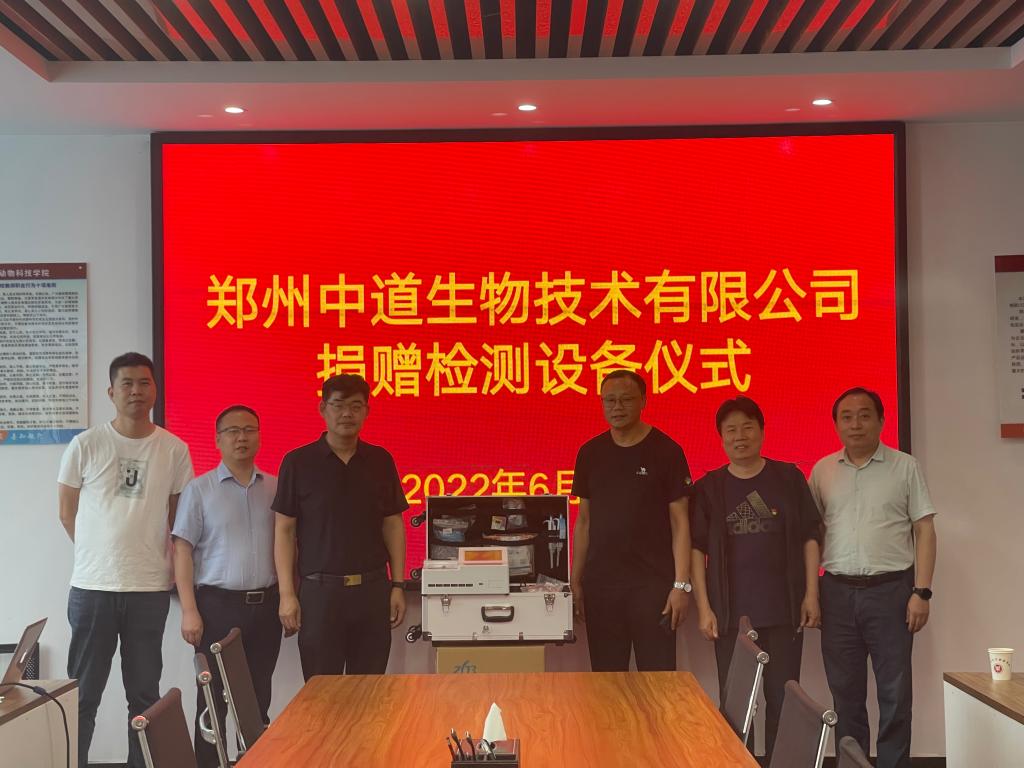 6月30日上午,郑州中道生物技术有限公司禽快速检测仪捐赠仪式在善知楼B301举行。动物科技学院党委书记王建伟、副院长牛晖及郭良兴博士参加仪式。