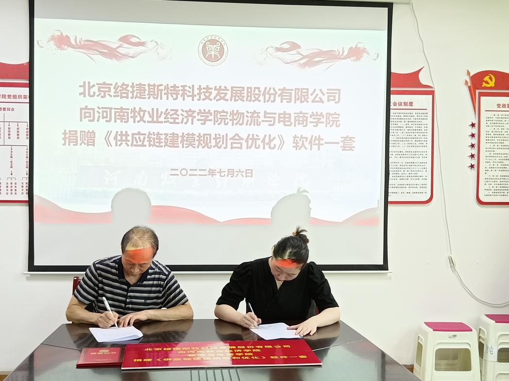 为深入推进高端供应链领域产学研合作,促进高端供应链建模人才培养和院校专业转型升级,7月6日上午,物流与电商学院院长曹献存与北京络捷斯特发展股份有限公司负责人李华婷在英才校区教学办公楼312会议室签定合作协议,接受由该公司捐赠的《供应链建模规划和优化》软件。随后,双方就课程开发、学术研究与学科竞赛、冷藏工培训、物流工程专业建设以及人才培养等内容进行了交流。秉承资源共享、优势互补、互惠双赢的合作思路,共同探讨推动物流管理与物流工程专业建设问题。