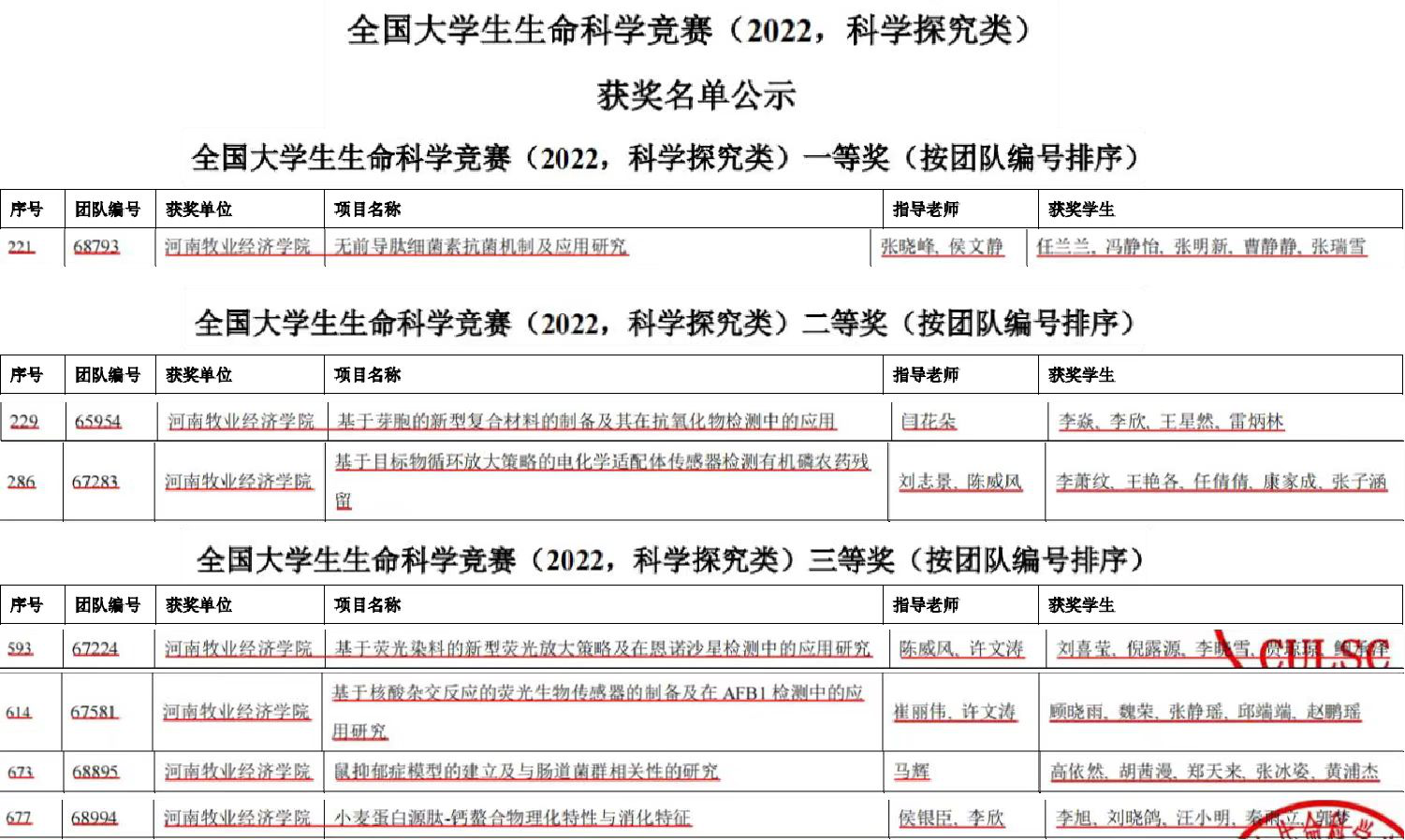 此次竞赛自2021年7月启动网上报名以来,共有来自全国31个省市,528所高校的8614支有效团队报名参加竞赛。经过网络评审和省级选拔,最终508项参赛项目进入全国决赛。决赛采用线上答辩形式,由视频汇报、线上答辩、评委线下现场打分等环节组成,经过激烈的角逐,我校食品与生物工程学院(酒业学院)选报的《无前导肽细菌素抗菌机制及应用研究》荣获国赛一等奖;《基于芽胞的新型复合材料的制备及其在抗氧化物检测中的应用》等2个项目荣获国赛二等奖;《鼠抑郁症模型的建立及与肠道菌群相关性的研究》等4个项目荣获国赛三等奖。