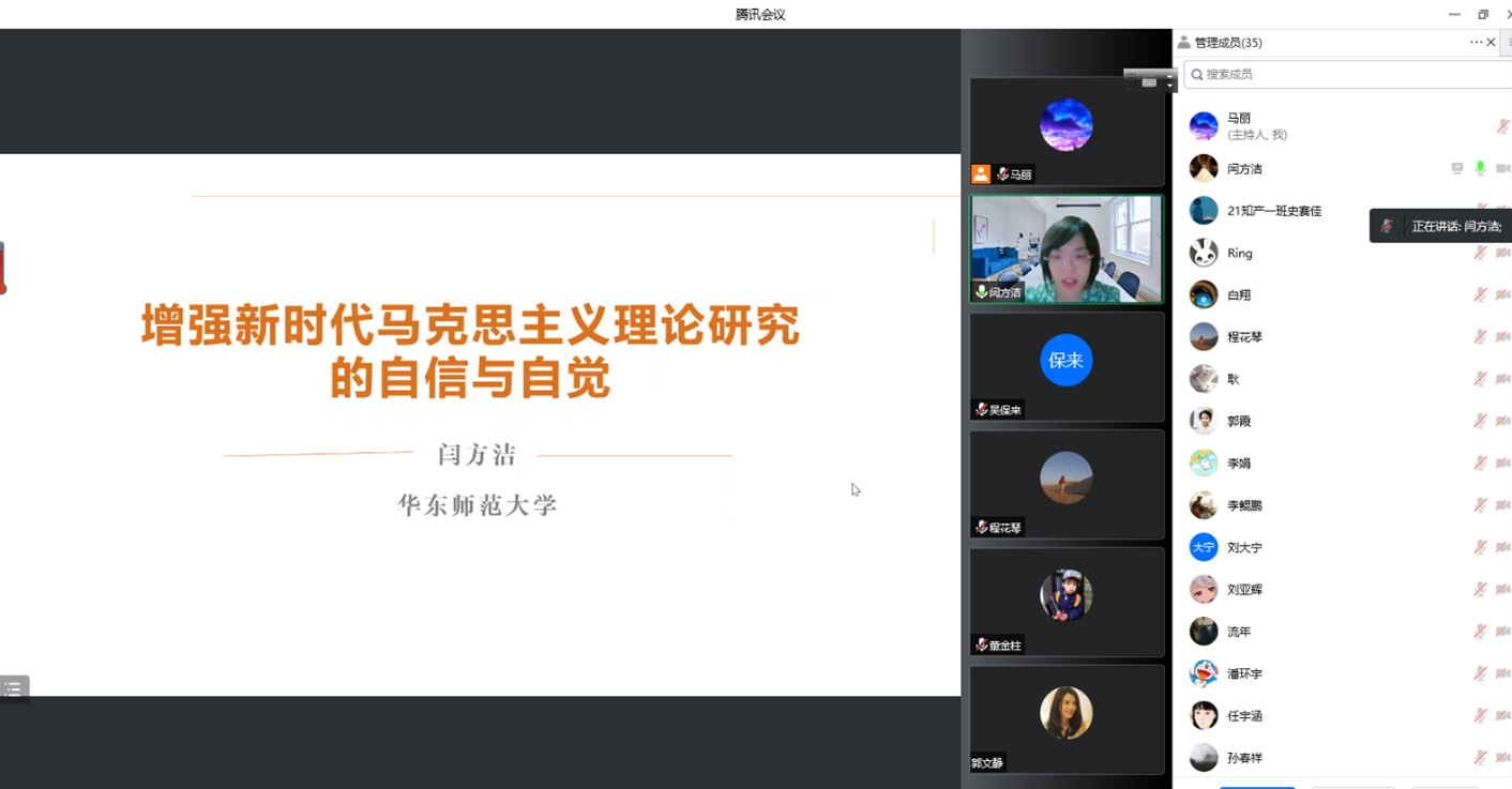 闫方洁从“坚持与发展”的辩证关系、“理论与现实”的互动、“概念与问题”的把握等方面研究马克思主义,阐述了做为新时代的马克思主义研究者,要增强理论研究的自信与自觉。她指出,马克思主义理论不是教条,而是行动指南,是指引人民美好生活的指南。因此,新时代马克思主义理论研究要在发展马克思主义中坚持马克思主义,要在统筹当今世界百年未有之大变局和中华民族实现伟大复兴战略全局中不断推进马克思主义中国化,要在积极回应实践呼唤中不断总结实践经验,时刻保持积极的研究热忱和充分的理论自觉。互动环节,闫方洁就学术与教学的关系与老师们进行了亲切交流。