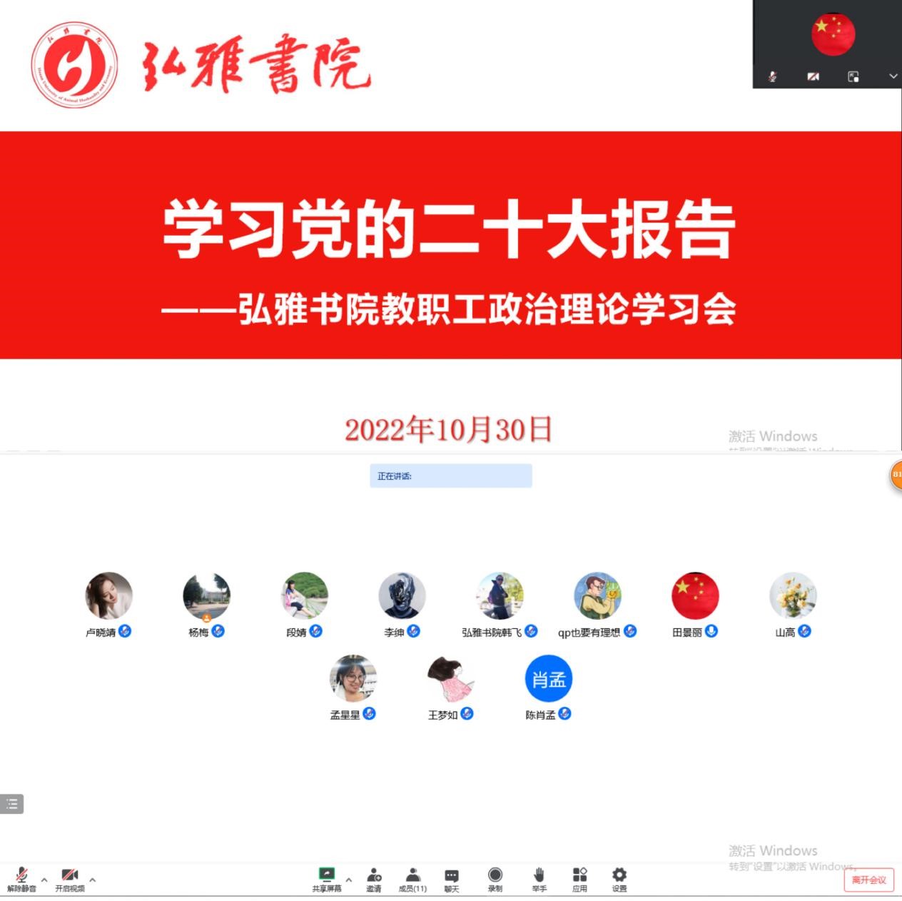10月30日晚,弘雅书院以线上方式召开“学习党的二十大 勇毅前行开新篇”为主题的政治理论学习会,学习宣传贯彻党的二十大精神。会议由书院党委书记田景丽主持,书院全体教职工参加。
