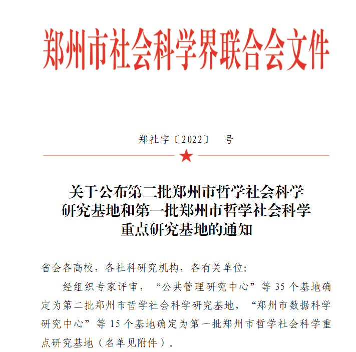 近日,郑州市社科联公布了第二批郑州市哲学社会科学研究基地名单,我校工商管理学院人才与人力资源发展研究中心入围。
