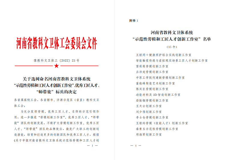 近日,河南省教科文卫体工会下发《关于选树命名河南省教科文卫体系统“示范性劳模和工匠人才创新工作室”的决定》文件,我校艺术学院“董晓峰陶瓷艺术创新工作室”获此殊荣。