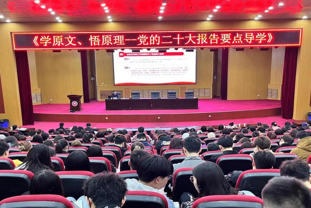 开班仪式后,作为学校党的二十大精神宣讲团成员,贾江以《学原文、悟原理——党的二十大报告要点导学》为题,做首场专题报告。他从党的二十大召开的基本情况入题,紧扣“七个聚焦”要求,围绕党的二十大主题、主要成果,过去五年的工作和新时代十年的伟大变革,马克思主义中国化时代化,新时代新征程中国共产党的使命任务等方面,结合自身学习思考,对党的二十大精神进行了系统解读和深入阐释。宣讲报告主题鲜明、内容详实、脉络清晰、论述深刻,具有很强的针对性和指导性,为全院师生深入学习、准确把握、全面贯彻党的二十大精神提供了指导和帮助。